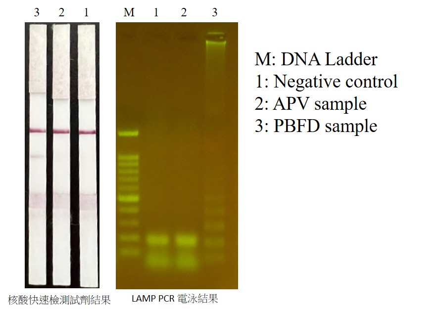 | Application Note: | 鸚鵡喙羽症(Psittacine beak and Feather Disease, PBFD)是一種由DNA病毒引起的鸚鵡傳染疾病。病毒藉由病鳥的排泄物和羽屑進行傳染,患病的鸚鵡會出現脫羽、羽毛變形及鳥喙變形等症狀。 PBFD LAMP 核酸快速檢測試劑是利用專一性PBFD的引子先進行LAMP核酸快速擴增(1小時),再利用核酸快速檢測試劑進行快篩試劑訊號的呈現,方便判讀、快速,不需電泳…等設備。 |